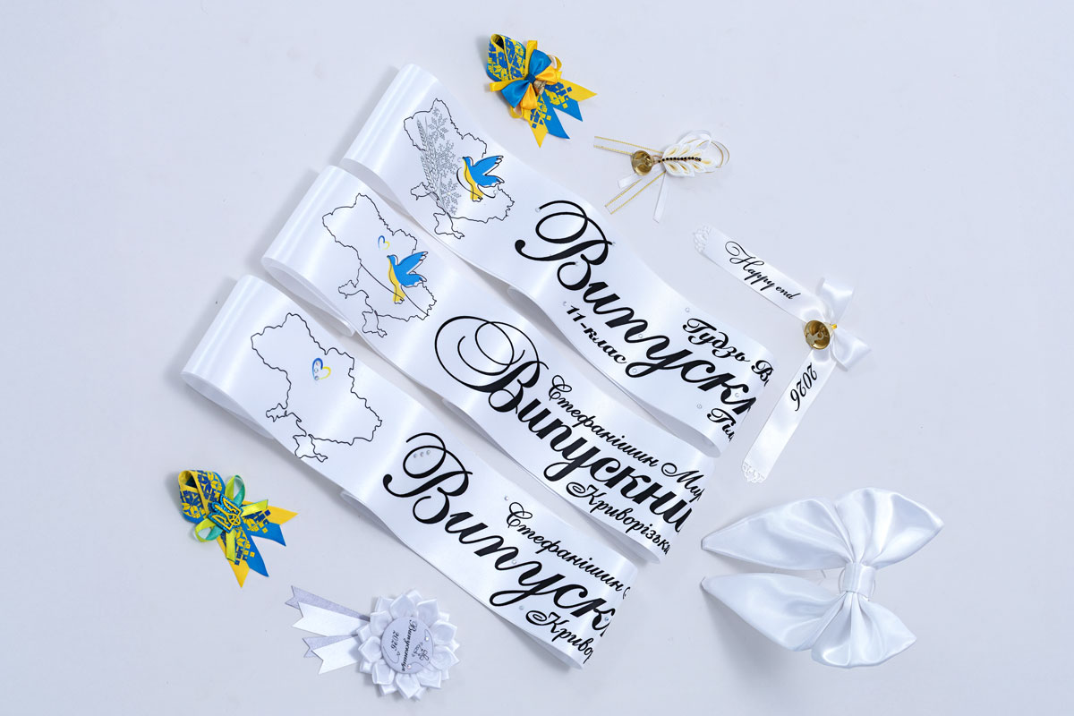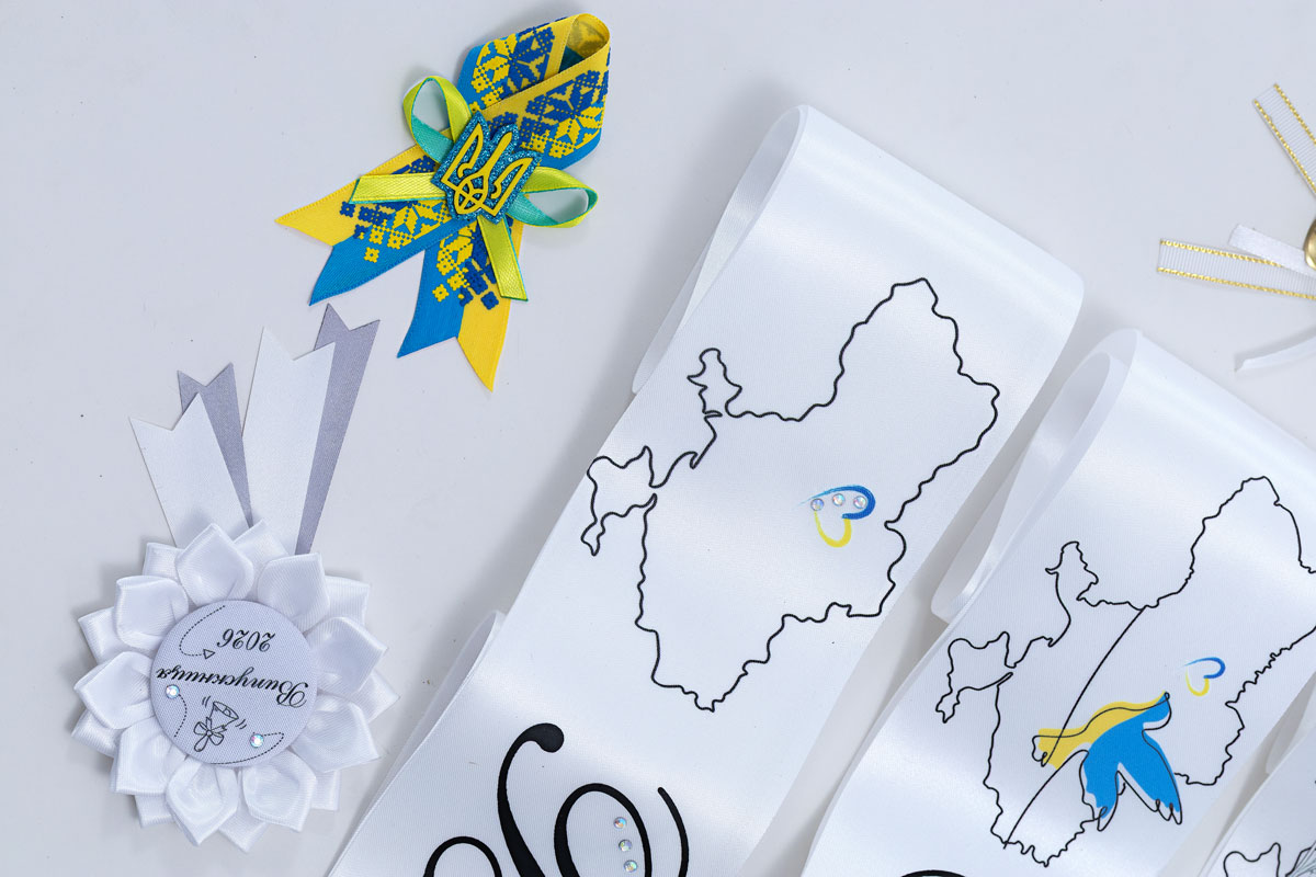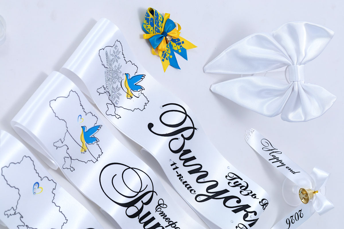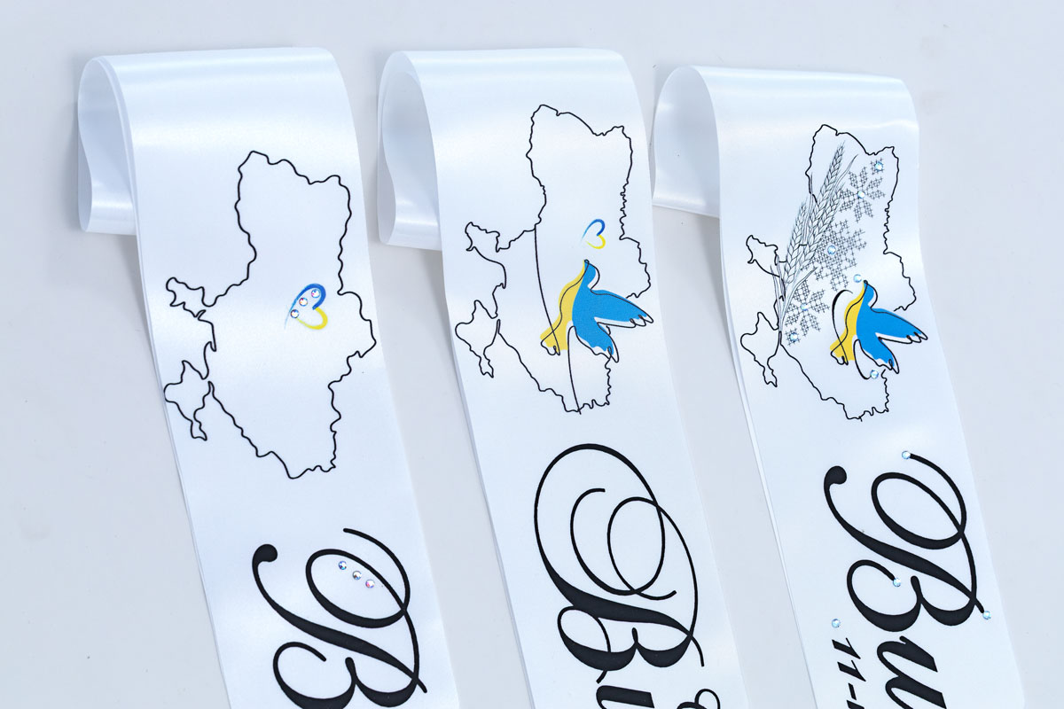 Лента из белого атласа (2 м длиной, 10 см шириной) с изысканным контуром Украины и голубем. Черный дизайн с тонкими вкраплениями желто-голубых акцентов. Эта патриотическая лента сочетает классическую эстетику с современным украинским духом.