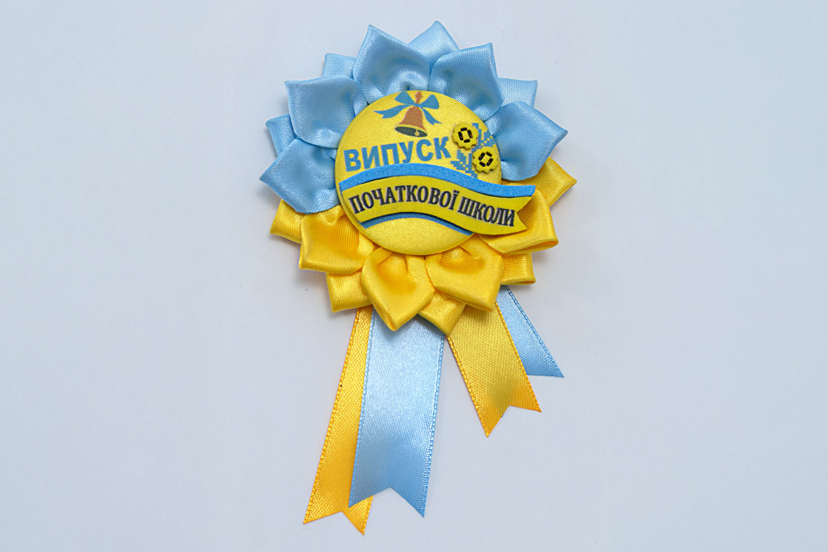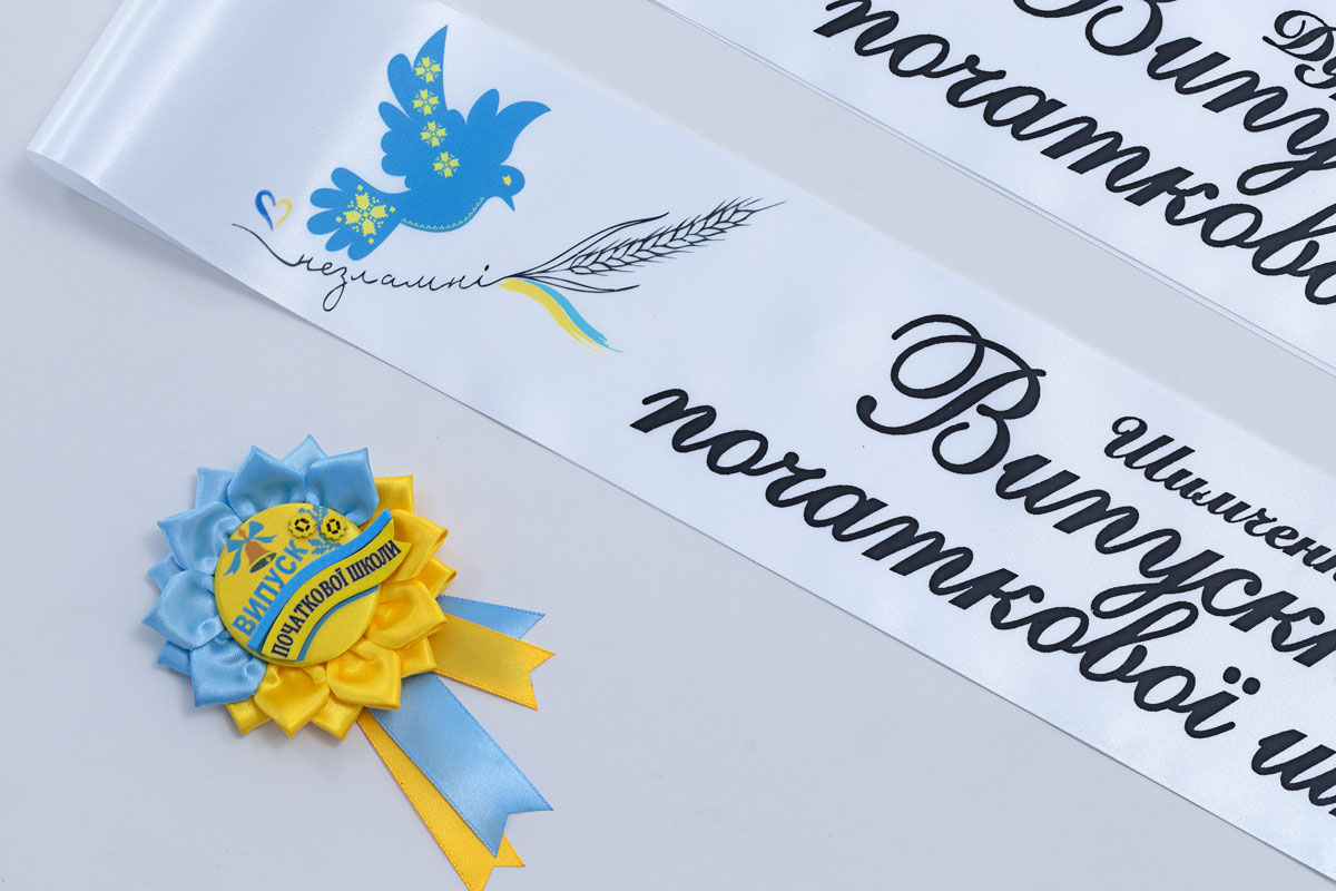 Выпускная лента на белом атласе — символ гордости. Колосок, надпись «Незламні», голуби в орнаменте создают особую атмосферу. В наборе — стильный значок-подсолнух ручной работы с различными лентами. Черное нанесение и полноцветная желто-голубая печать подчеркивают патриотизм. Длина ленты — 1,8 м, ширина — 10 см.