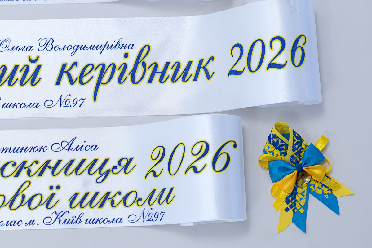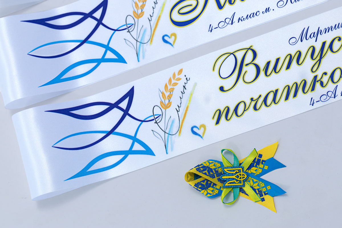 Именная лента на выпускной для учеников начальной школы выполнена в праздничном патриотическом стиле. Дизайн украшен гербом Украины и декоративными элементами в виде колосков — символов знаний, достатка и будущих достижений. Сине-желтые акценты гармонично сочетаются между собой и подчеркивают торжественное настроение праздника. Лента имеет индивидуальную надпись с именем выпускника, что делает ее особенной и запоминающейся. В комплект также входит брошь с гербом с рельефным орнаментом или вариант с бантиком и колокольчиком. Длина ленты — 1,70 м, ширина — 10 см.